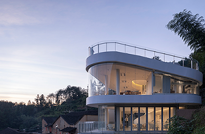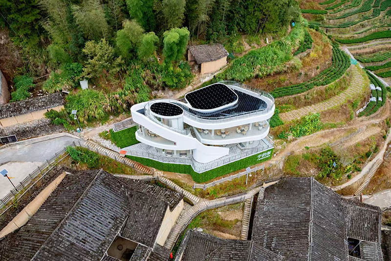 下黨零碳示范的主體建筑“寧的茶”零碳茶館是一座上下兩層的純白建筑。屋頂以莫比烏斯環(huán)為設(shè)計靈感,將可持續(xù)理念貫穿在每一處細節(jié)。整個建筑外觀上應(yīng)用大面積超白玻璃和UHPC超高性能混凝土,滿足通透的視野、充足的采光的同時,有效降低能源消耗。